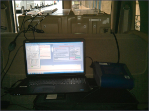 To demonstrate the utility of a mobile monitoring vehicle a pilot scale setup was put together based on the seniors’ conceptual design. A 1990s, 12-passenger Ford van owned by the CAEE department -for field trips and transporting equipment- served as the wheels of the operation. Selected for its size and a roof design that allows for easily mounting test equipment, the van evolved into a modified mobile laboratory during the spring term.