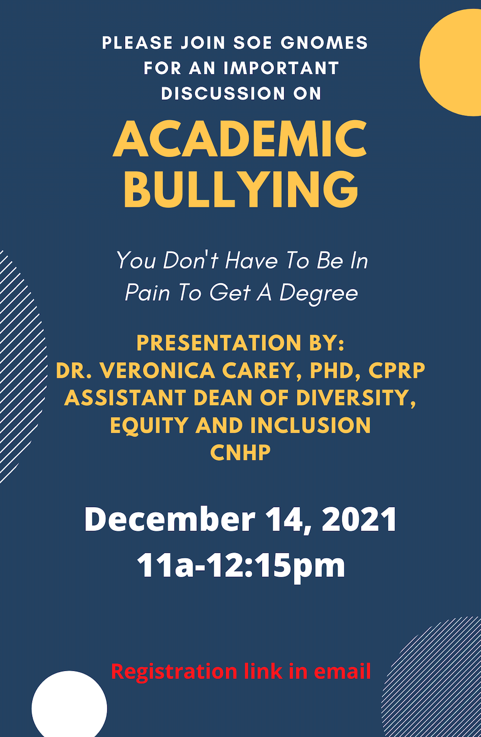 Join the School of Education's Graduate Student Association (GNOMES) for a presentation on Academic Bullying with Dr. Veronica Carey, PhD, CPRP, Assistant Dean of Diversity, Equity and Inclusion in the College of Nursing and Health Professions on December 14, 2021 11:00 a.m. - 12:15 p.m. EST via Zoom. Register here.