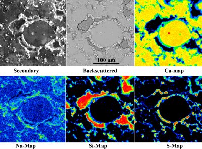 Scanning electron microscopy micrographs and elemental maps of bulk of Lauer sample showing (a) secondary and (b) backscattered images; the rest of the images represent elemental maps of Ca, Na, Si, and S. Note that the size of the calcite aggregates is 50–500 mm.