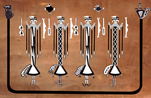 The Navajo Lounge featured a series of 13 murals based on traditional Navajo Sand paintings. Stockmal and Wu modeled these paintings, as well as color palettes for furniture, based on photographs of ephemera, items and furnishings and architectural drawings.