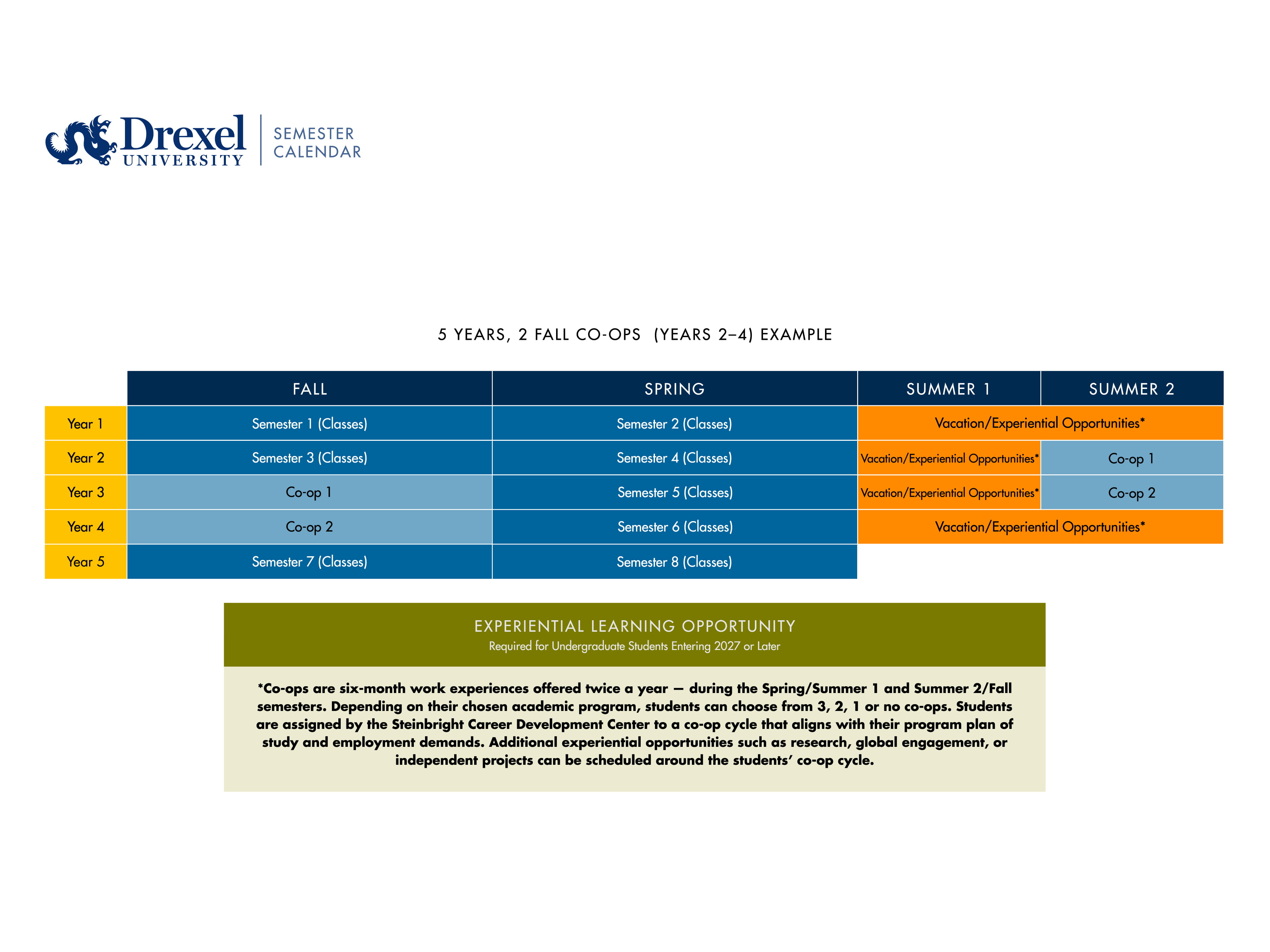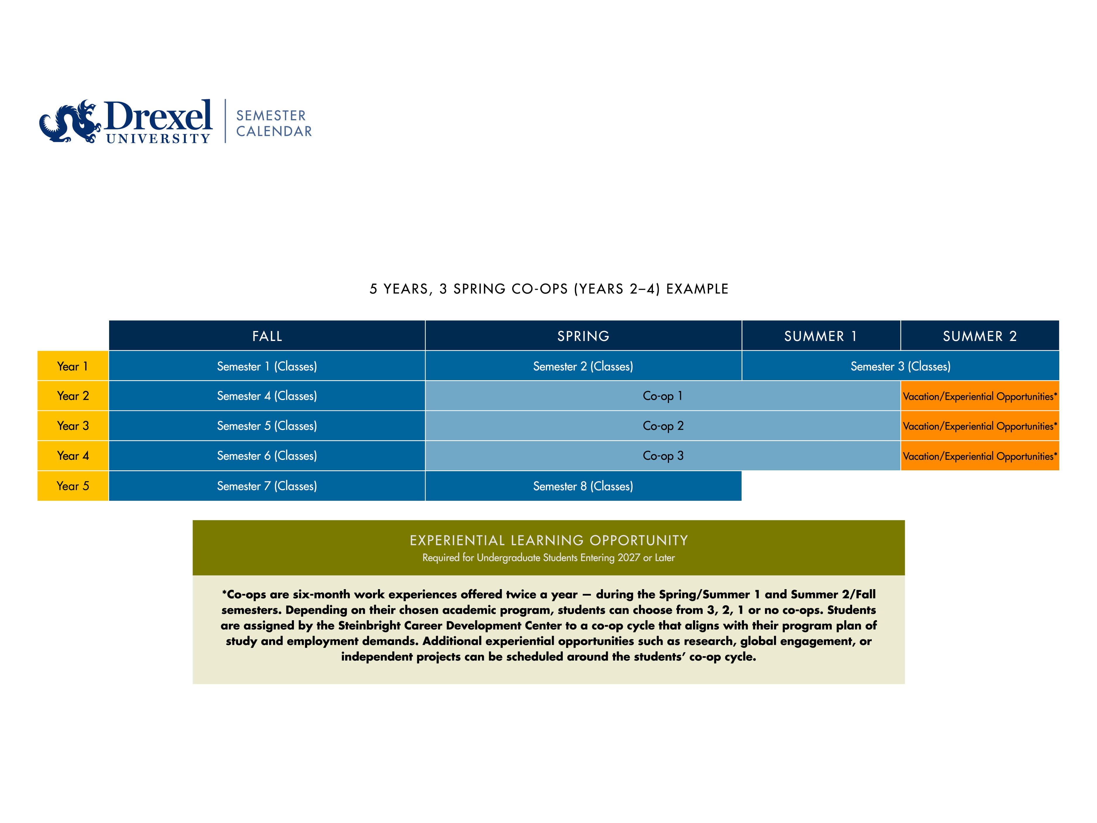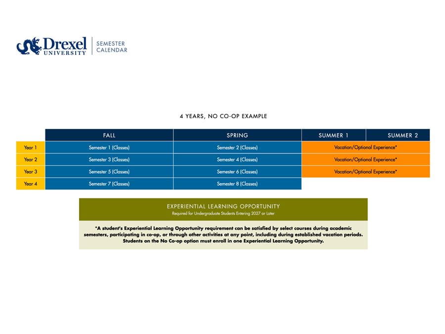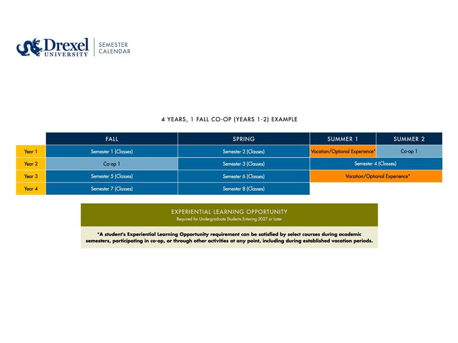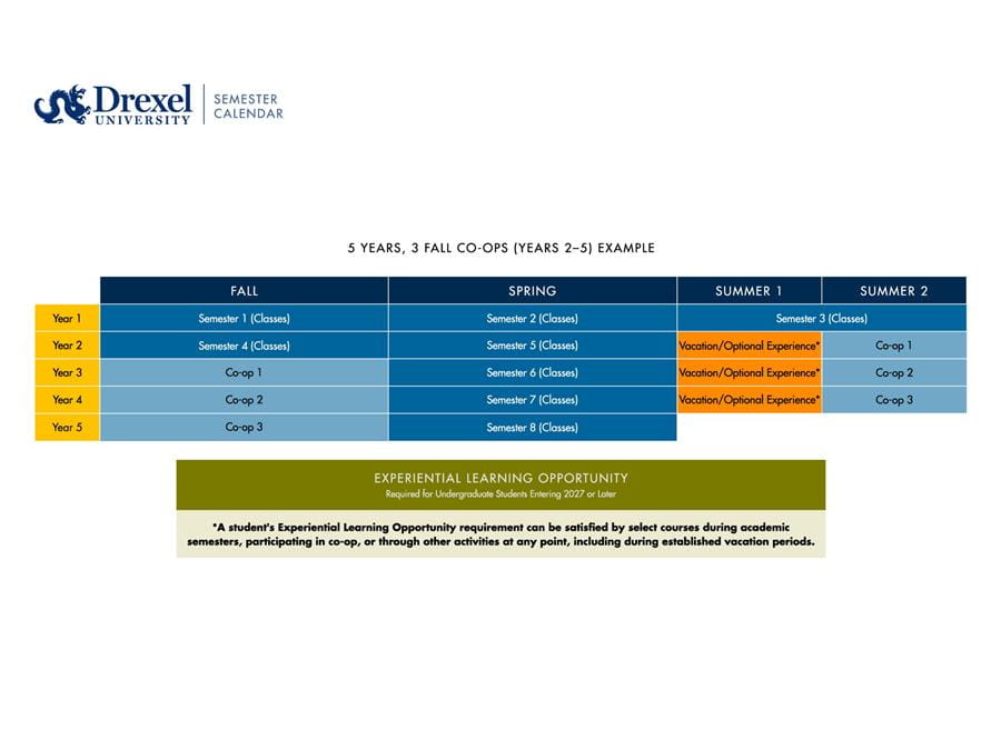 Beginning in the 2027–28 academic year, Drexel will offer more ways for students to experience life as a Dragon on a semester-based education. While in many cases you can choose the number of co-op experiences that best fit your goals, the timing of each co-op is predetermined and illustrated in the five academic schedule samples below. To explore all possible options, open the accordions for a full list of potential pathways. For most students, completing degree requirements will involve eight semesters of full-time study. Tuition is charged for the courses in which students are enrolled, and there are no tuition charges during co-op experiences.