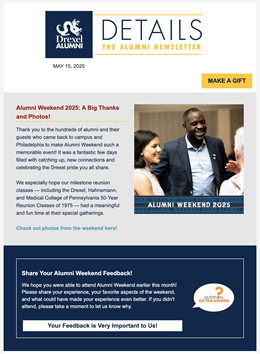 Details, the e-newsletter for Drexel alumni, is a convenient monthly reminder showcasing Alumni Association and Drexel news, events and activities.