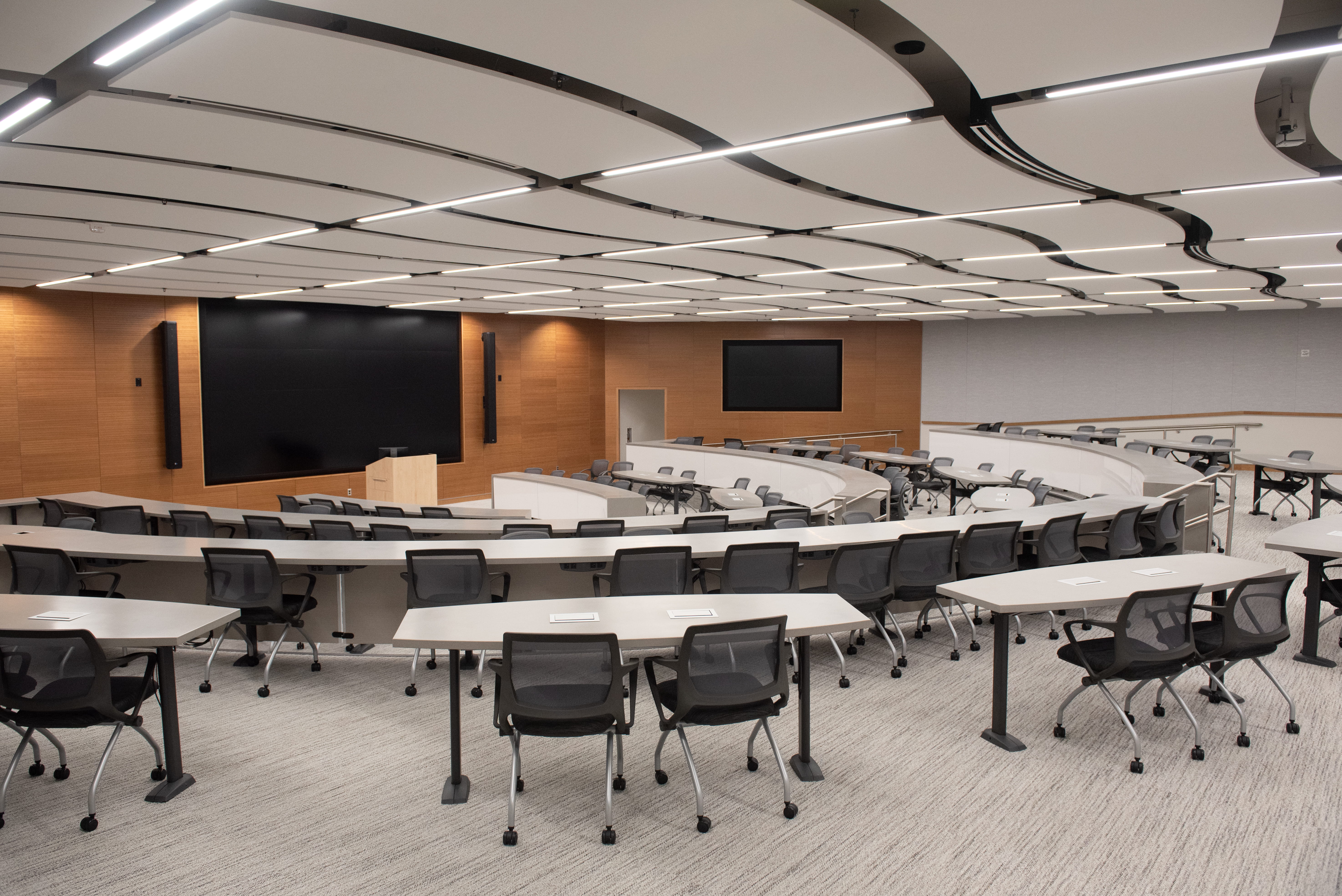 - The space is equipped with 14 student tables, each with its own large monitor for projection from student devices or from an instructor station.