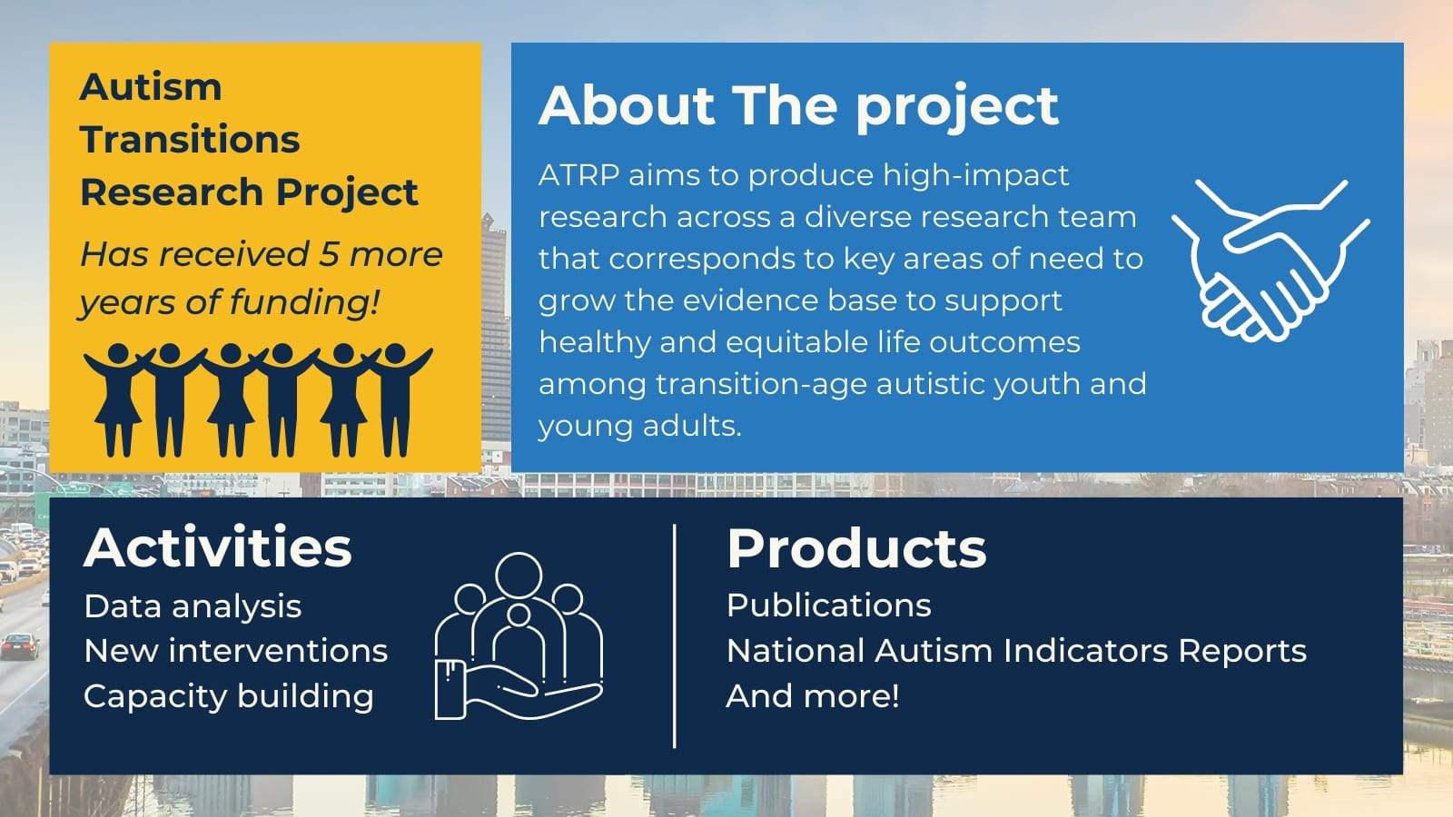 Built on previous HRSA investment which led to the production and dissemination of seven National Autism Indicators Reports and more than 25 peer-reviewed publications, the Autism Transitions Research Project aims to produce high-impact research that corresponds to key areas needed to grow the evidence base to support health and equitable life outcomes among transition-age autistic youth and young adults.