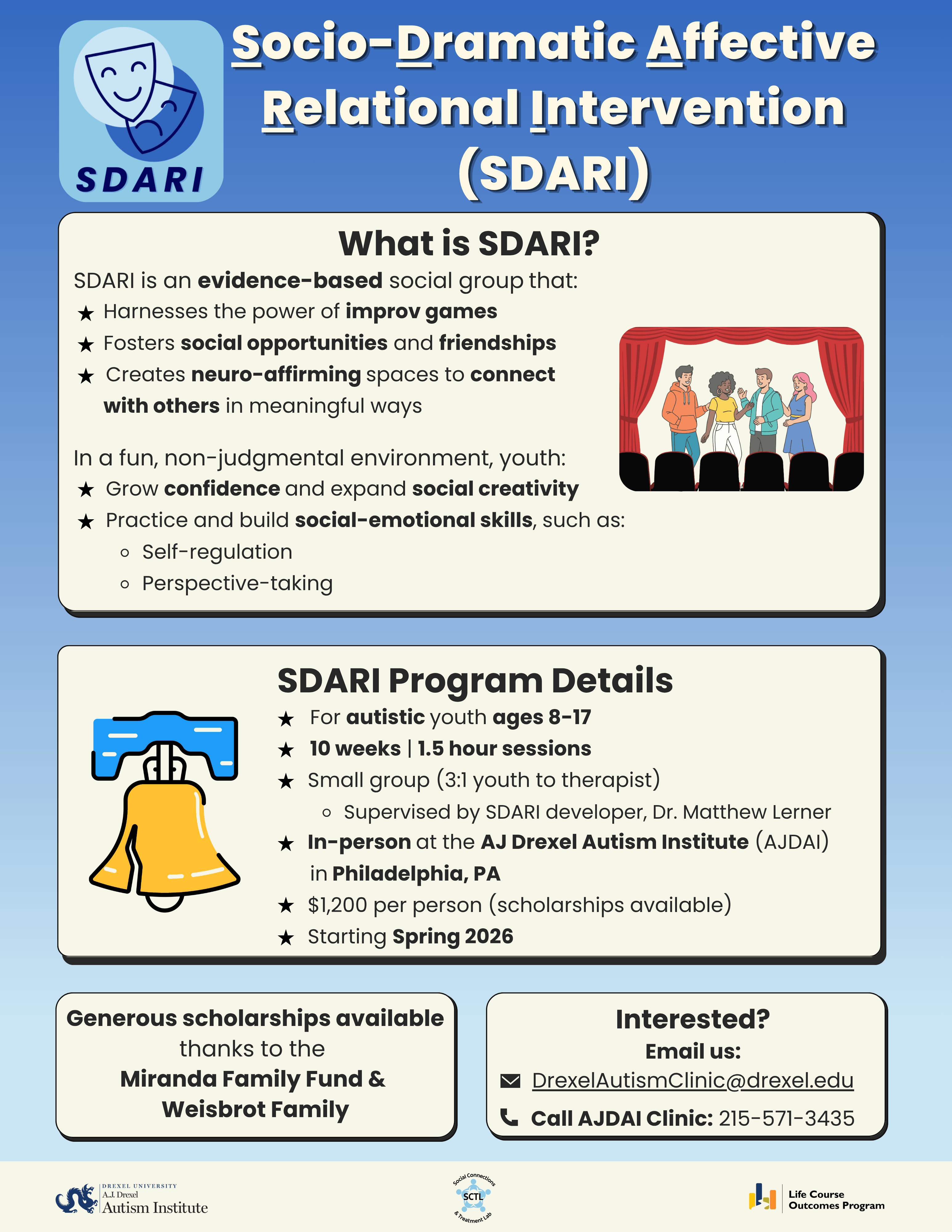 Socio-Dramatic Affective-Relational Intervention (SDARI) is a manualized social program developed by Dr. Matthew Lerner and colleagues to improve the social-emotional confidence and competence of autistic youth in an affirming group format. SDARI involves concrete presentation of social pragmatics goals, and the connection of those goals to specific highly-interactive, semi-structured, naturalistic pragmatically-enriched activities, including the novel use of drama-based activities (such as improv games). These goals are addressed and targeted according to the developmental needs of the individual participants.