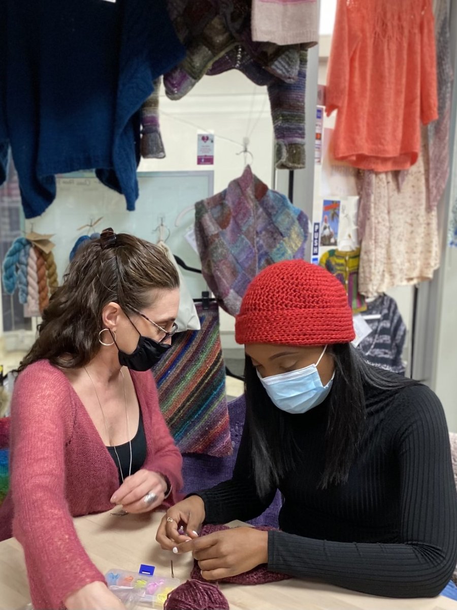 We've been in business for a little over five years. I would generally have group classes, but during the pandemic I shifted to mainly doing private lessons. A typical day involves meeting with clients and giving them lessons, but also trying to schedule time where I can just help them with their projects. Every other Thursday we have a ‘come hang out and knit and crochet’ night. My work varies day to day, and that's been a big adjustment for me after working in a laboratory. I have a lot of help from volunteers and other people, but still there's always something to be done.