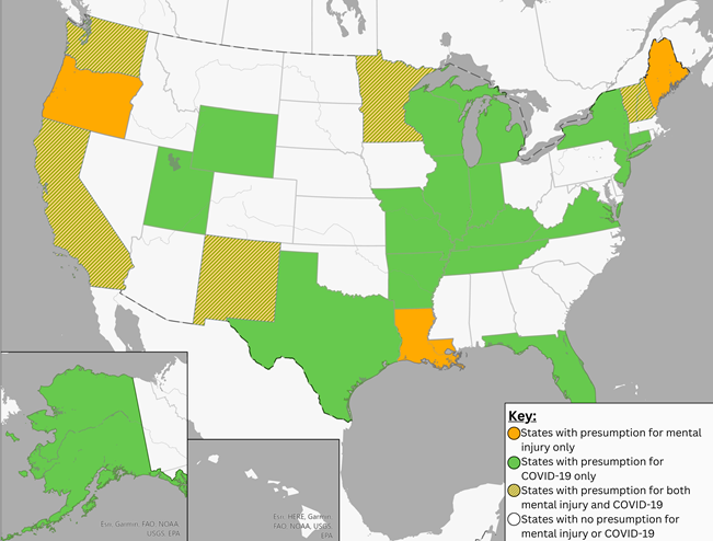 The number of states that have presumption of causation laws for diseases associated with firefighting and EMS work, like cardiovascular disease, respiratory disease, and infectious disease, far outweighs the number of states that have mental health presumption laws. For example, 23 states were able to pass presumption laws for COVID-19 during the pandemic, while only 9 states have presumption of causation laws for mental health conditions.