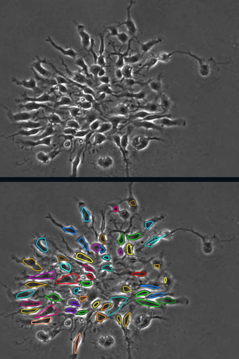 Once checked by human eyes, the images are run through the program again for more precise delineation of the cells—this process is especially arduous when tracking stem cells because they often have long arm-like appendages called processes that can look like a separate cell.