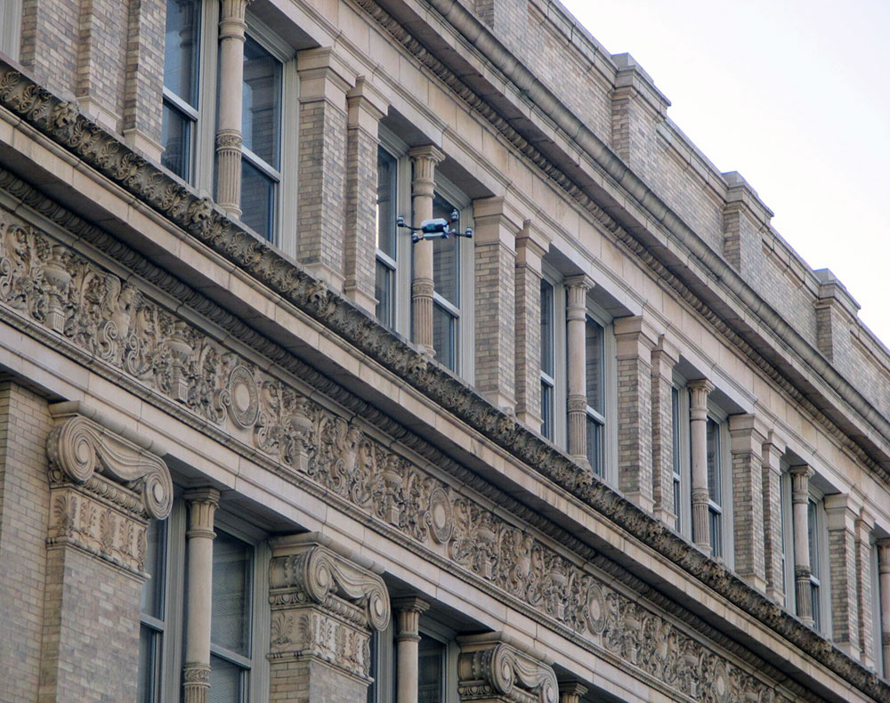 Then, last spring, two of Kontsos’ BS/MS students tested the NOESIS software on Main Building here on campus as part of a senior design project. A drone collected images from the entire façade. The images were run through NOESIS, which stitched them together to provide an assessment of window condition, the presence of cracks, and the energy efficiency of the building.