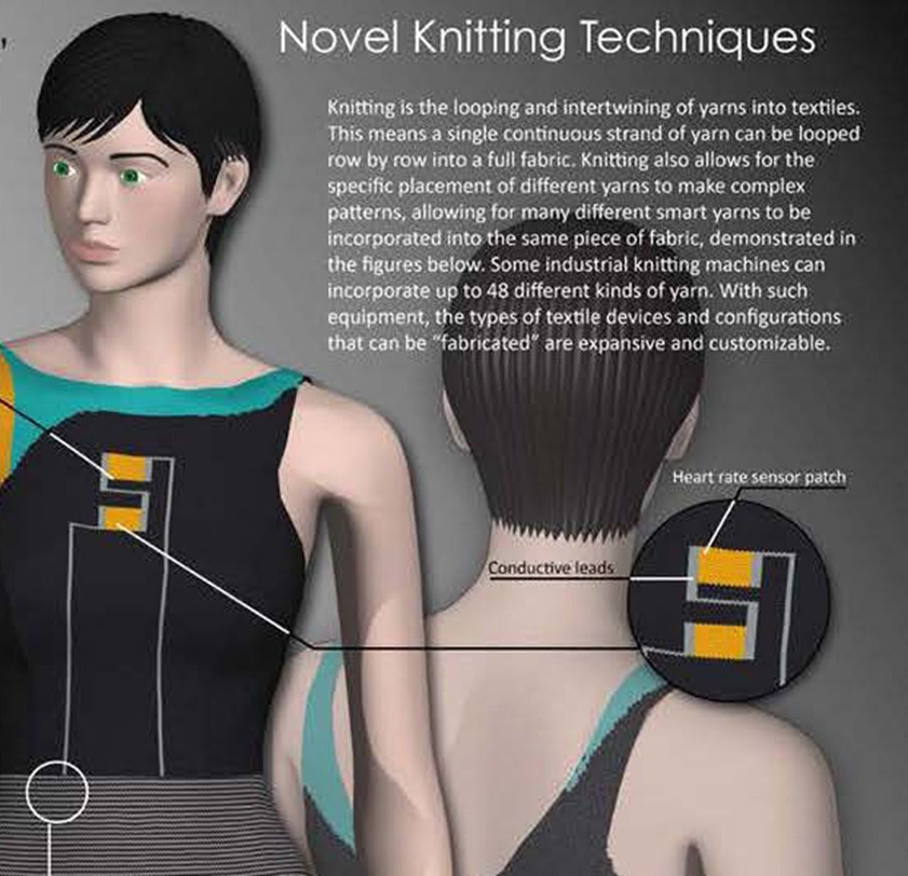 "Wearable Power" depicts a method for knitting supercapacitors from stainless steel and electrolyte-treated yarn, a process the group is prototyping in the Shima Seiki Haute Technology Lab at the ExCITe Center.