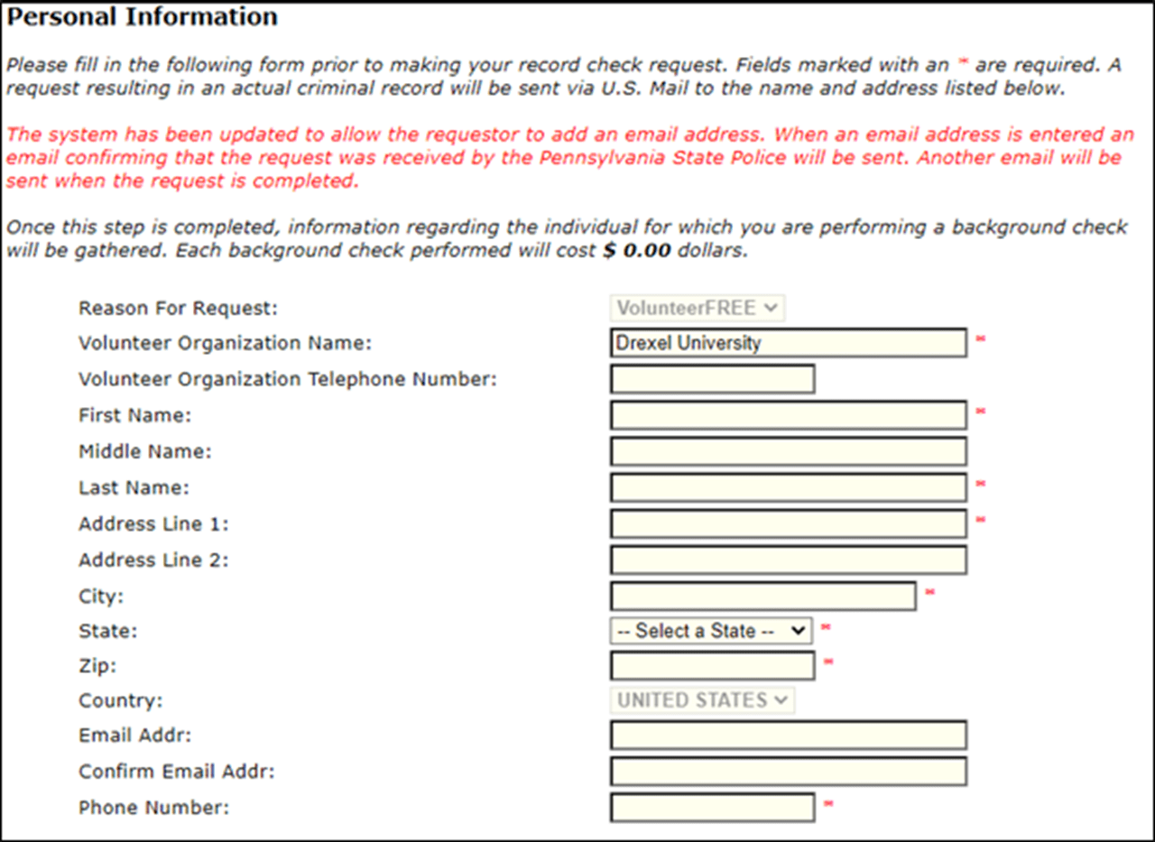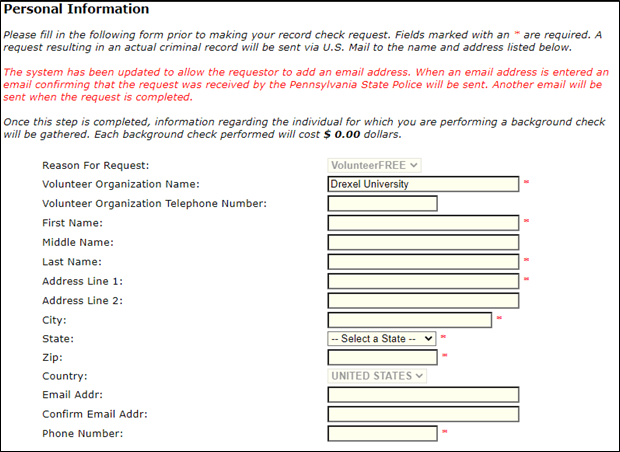 Human Resources would like to highlight that this is a state form and may not be inclusive of all genders, races, or ethnicities. Should you need assistance during this process, please email clearances@drexel.edu.