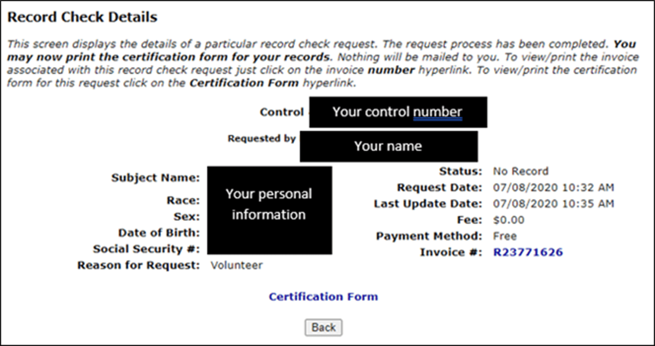 - You should see your name on the next page. Click “Submit.” Your clearance should be ready immediately; continue the directions below to retrieve your results.