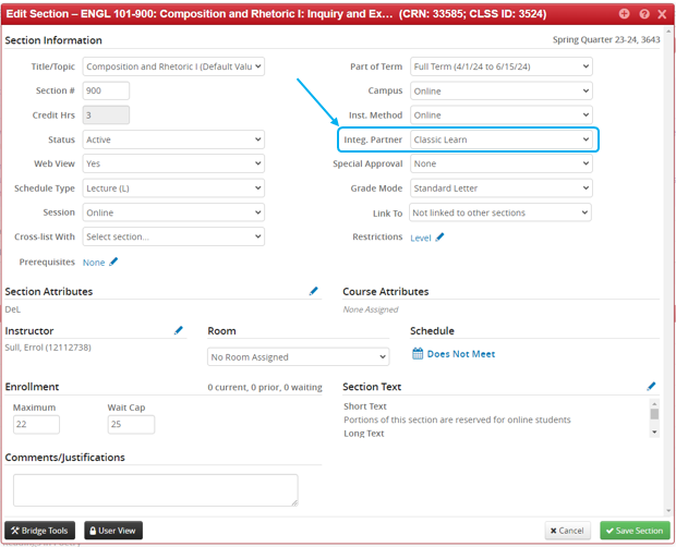 To update the field for a course section, simply open the section in CLSS Section Editor and indicate the desired Integration Partner in the Integ. Partner drop-down (Classic Learn, Ultra Learn, No Online Shell Needed) before clicking "Save Section." Department schedulers who have questions about this process can contact the Registrar's Office by emailing opermail@drexel.edu.