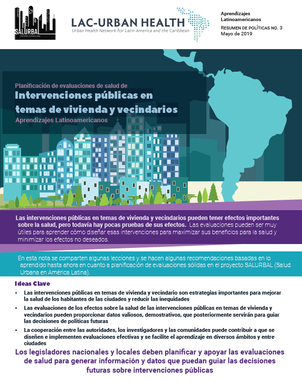Planning Health Evaluations of Housing and Neighborhood Interventions: Lessons from Latin America discusses opportunities to integrate health evaluations into the design and implementation of urban policies. Housing and neighborhood interventions can be important interventions that deliver packaged benefits to improve urban health and well-being, but more evidence is needed regarding their effects under different conditions and the pathways underlying these effects to inform policy changes. The policy brief details potential health effects and evaluation designs, recommendations for intersectoral planning, and shares three case studies of current evaluations from the SALURBAL project.