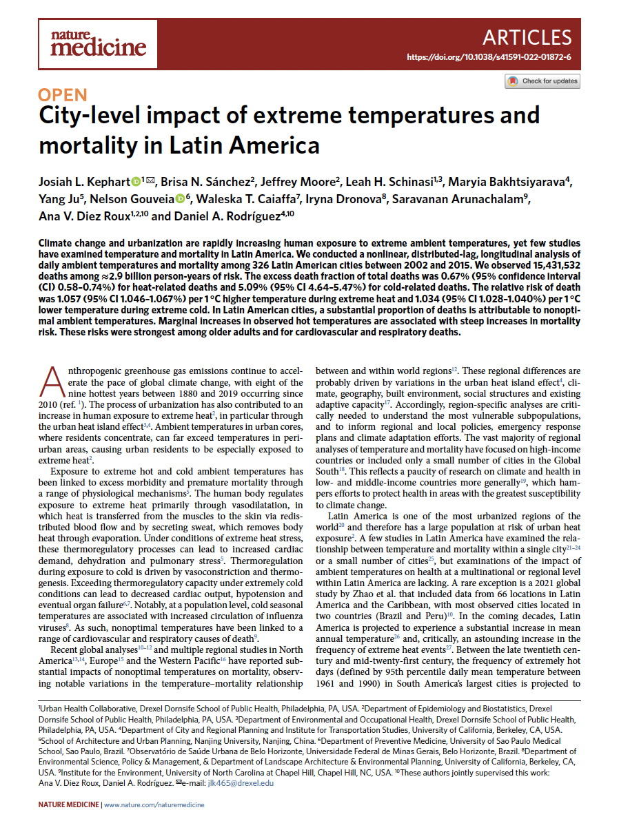 This article published in Nature Medicine describes variability and predictors of life expectancy and proportionate mortality in 363 cities across nine Latin American countries. The results highlight considerable heterogeneity in life expectancy and causes of death across cities of Latin America, revealing modifiable factors that could be amenable to urban policies aimed toward improving urban health in Latin America and more generally in other urban environments.