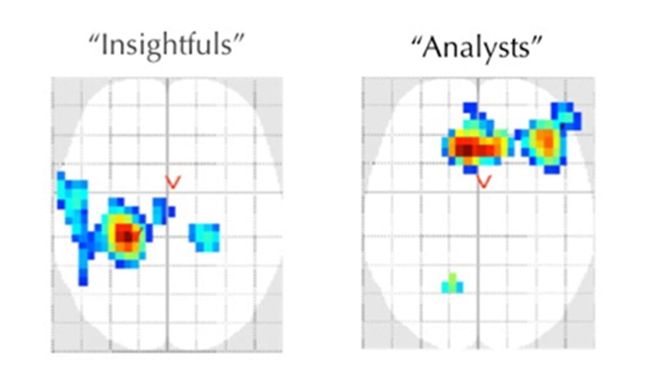 Analysts showed higher levels of activity in their frontal lobes. Insightfuls showed more activity in posterior brain areas, specifically, the temporal and parietal lobes.