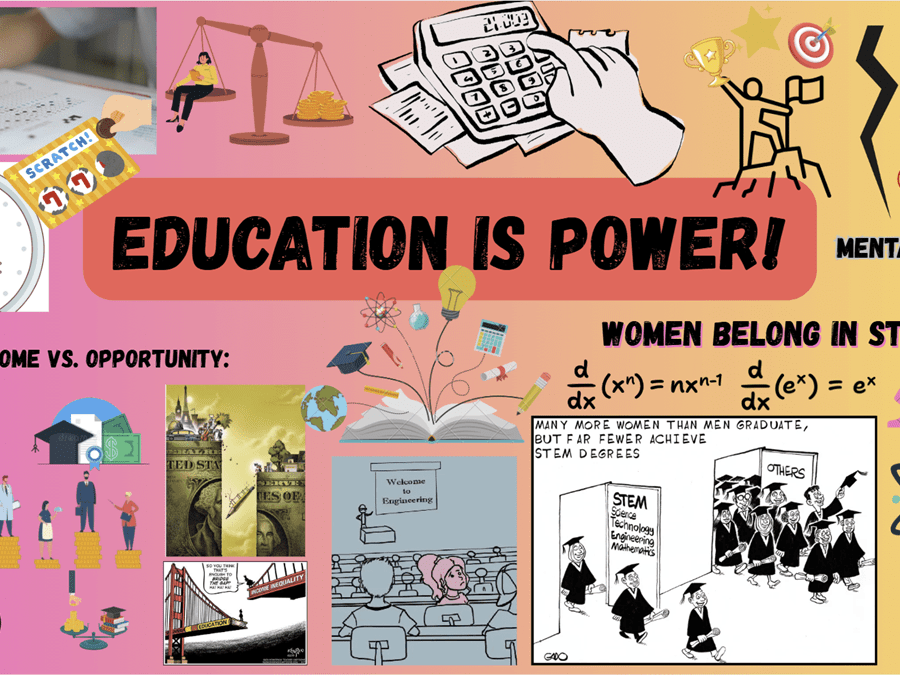 This mural focuses on educational inequality, including school funding, the pressure of grades and getting ahead, and disproportionate numbers of men and women in STEM education.