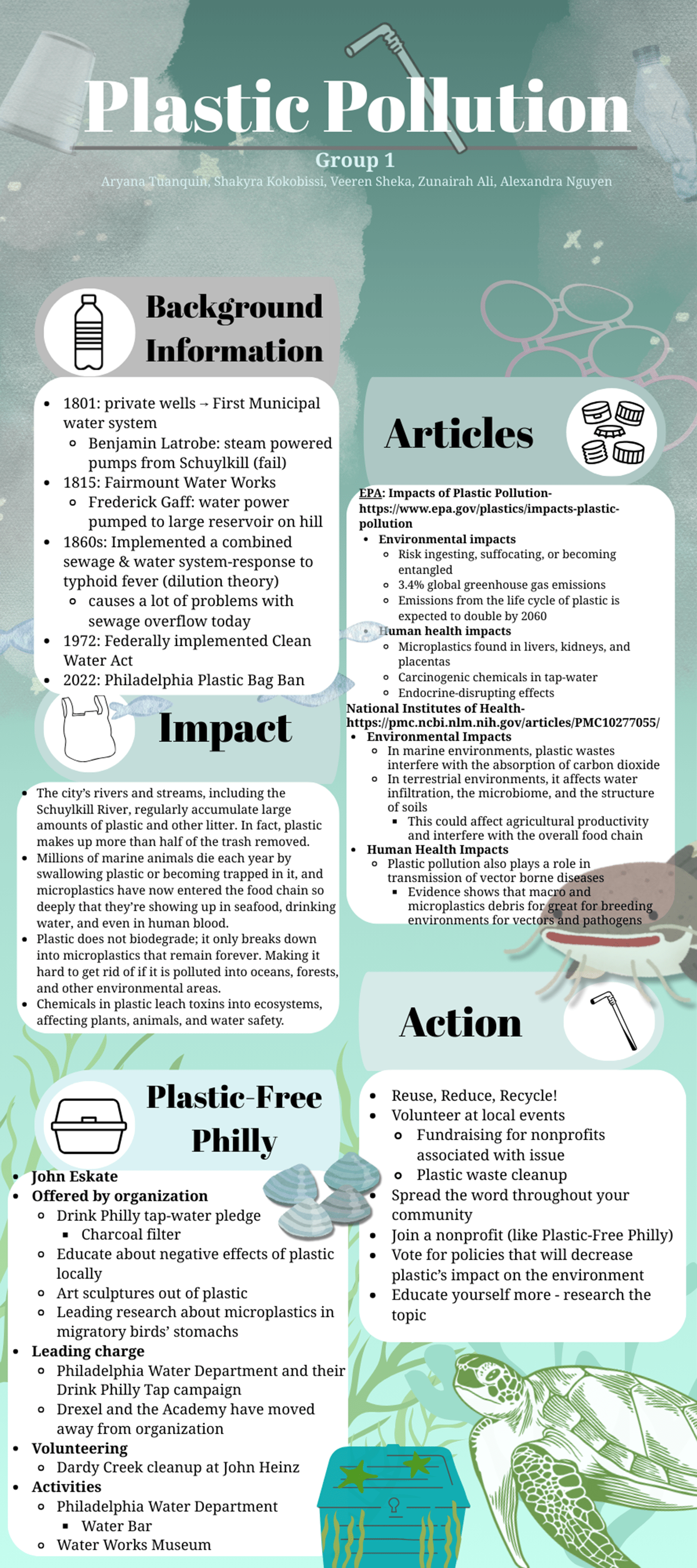 These students focused their project on plastic pollution and water quality in Philadelphia. One student in the group wrote this about their infographic: