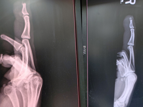 The patient's own nail was used in a process to give the repair integrity. The emergency department physician started with an initial suture through the nail and then the tip to bring the tissue together under the nail. Then he worked around the wound with 4-0 Prolene sutures x 14 in total. Finger splint applied.