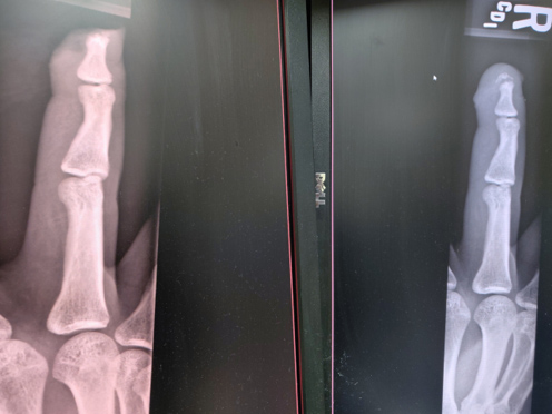 After reviewing the X-ray at bedside, emergency department physician proceeded with repair of the tissue. The amputation had left the nail intact as you can see on the lateral X-ray.