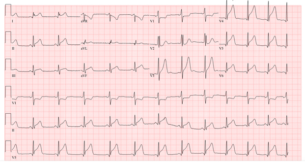 - Given that the initial EKG showed diffuse ST elevations with J point elevations, along with ST depressions in leads aVR and aVL, there was high concern for pericarditis.