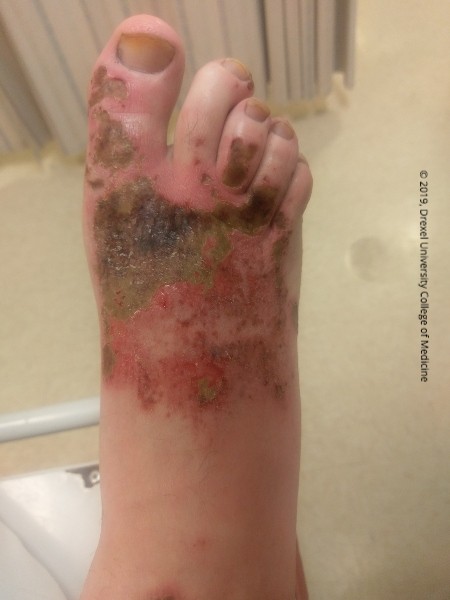Skin lesion caused by an alkaline liquid cleaning product that contains 2-butoxy ethanol, sodium metasilicate, sodium alpha olefin sulfonate and sodium tripolyphosphate. Exposure to this product can cause skin irritation or eye irritation. Ingestion may lead to irritation of the esophagus or stomach. Alkaline burns case a liquefactive necrosis versus acidic burns, which cause a coagulative necrosis.