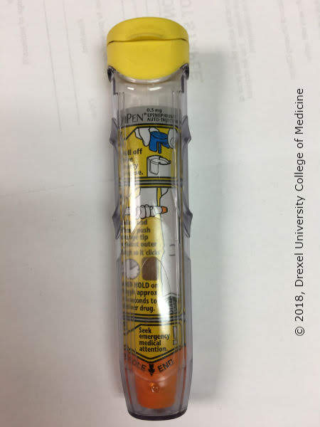 The EpiPen is an autoinjector filled with a dose of 1:1000 epinephrine designed for intramuscular injection for the emergent treatment of anaphylaxis. In addition to the adult dose of epinephrine pictured, there is a version of the device with a pediatric dose as well. Doses are 0.3 mg for adults and 0.15 mg for children.