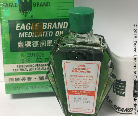 Herbal Medicated Oil: Topical pain-reliever ointment made with menthol (peppermint oil) and methyl salicylate (oil of wintergreen) which is used for temporary relief of muscle or joint pain caused by strain, sprain, or arthritis. The same active ingredients are sold as Bengay in the US, a popular sports OTC cream. Excessive application can result in first to third degree chemical burns. Dermal absorption of huge quantities of methyl salicylate can result in a clinical picture of salicylate poisoning and has resulted in the death of an athlete in 2007.
