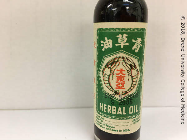 This herbal oil preparation topically used for muscle pain contains Rheum palmatum, a plant closely related to rhubarb. The primary toxicity of this plant is related to the oxalate compounds, including carboxylic acid, which can form poorly soluble crystals with calcium and other divalent cations. These crystals commonly form in the urinary tract and are associated with kidney stone formation. This particular preparation also contains camphor, which can cause seizures when used in high doses topically, or if ingested, especially in children.