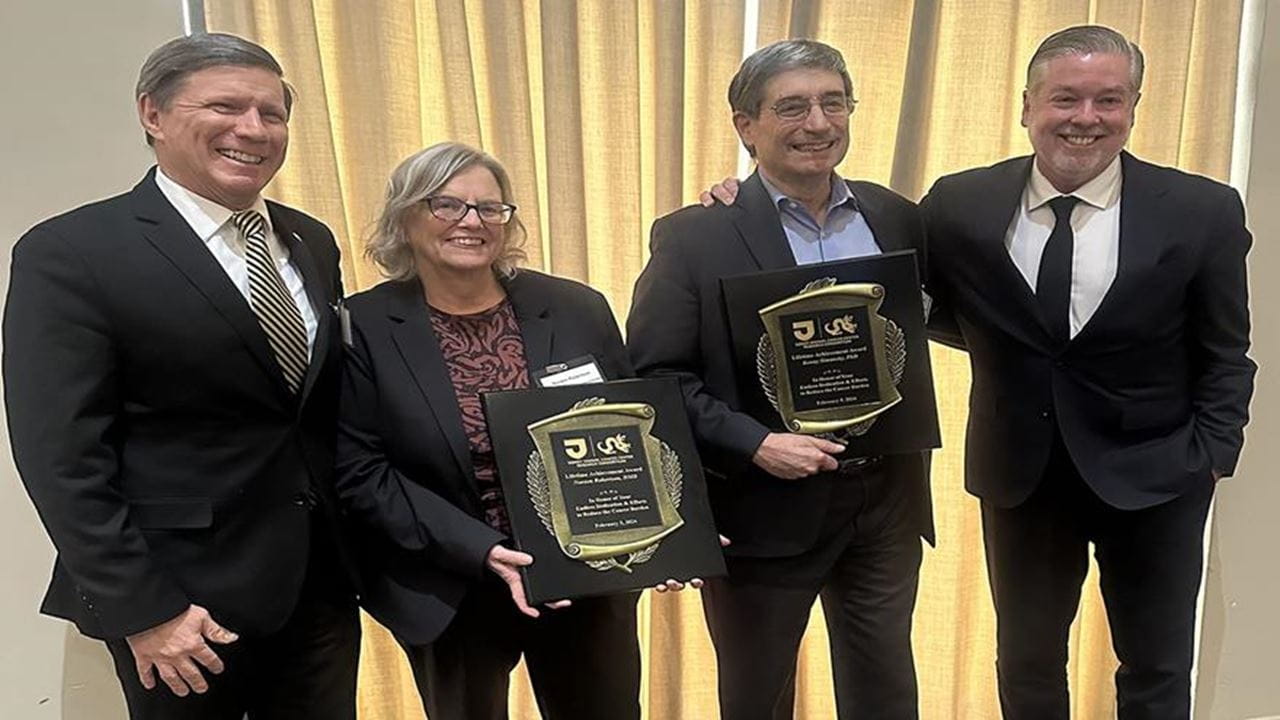 College of Medicine Charles B. Cairns, MD, (left) and President John Fry (right) were present to honor Noreen Robertson, DMD, and Kenny Simansky, PhD, with Lifetime Achievement Awards at the SKCC Research Consortium retreat in February. Simansky serves as senior vice dean for research at the College of