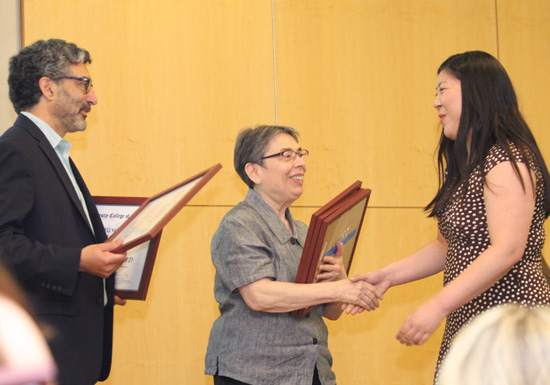 Drs. Steven Rosenzweig and Florence Gelo present a certificate of recognition from the Humanities Scholars program to Clarissa Chu.