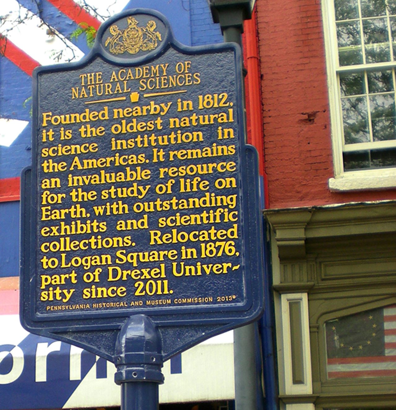 The marker says: “The Academy of Natural Sciences. Founded nearby in 1812, it is the oldest natural science institution in the Americas. It remains an invaluable resource for the study of life on Earth, with outstanding exhibits and scientific collections. Relocated to Logan Square in 1876, part of Drexel University since 2011.”