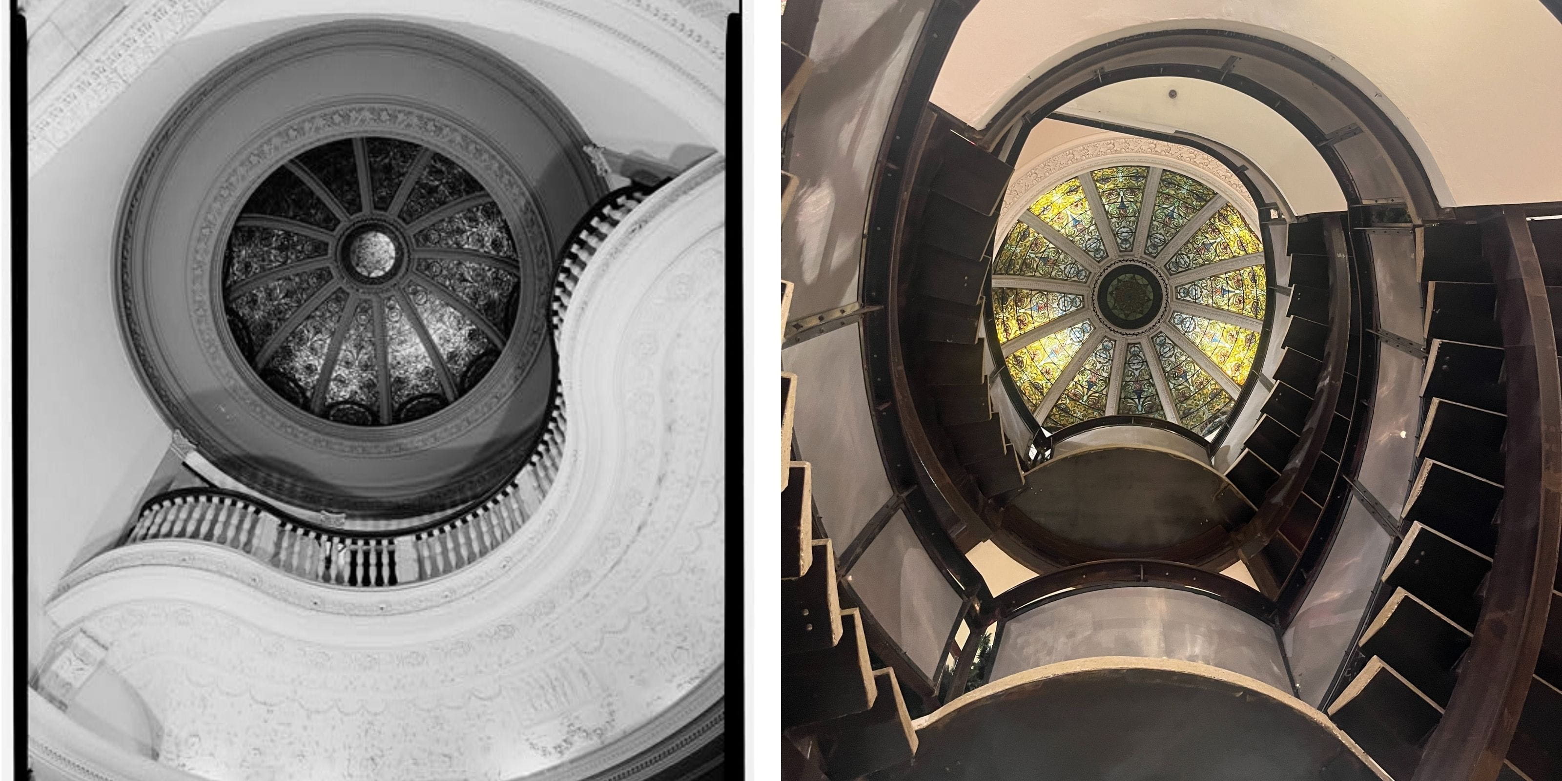 On the left is a 1974 public domain photograph from the Prints and Photographs Division of the Library of Congress showing the original Tiffany stained-glass dome before internal construction turned the mansion into a retail space (other photos taken during this time are also publicly available). The photograph on the right shows the same dome as seen today through the lowest level of the Anthropologie looking up though the spiral staircase.