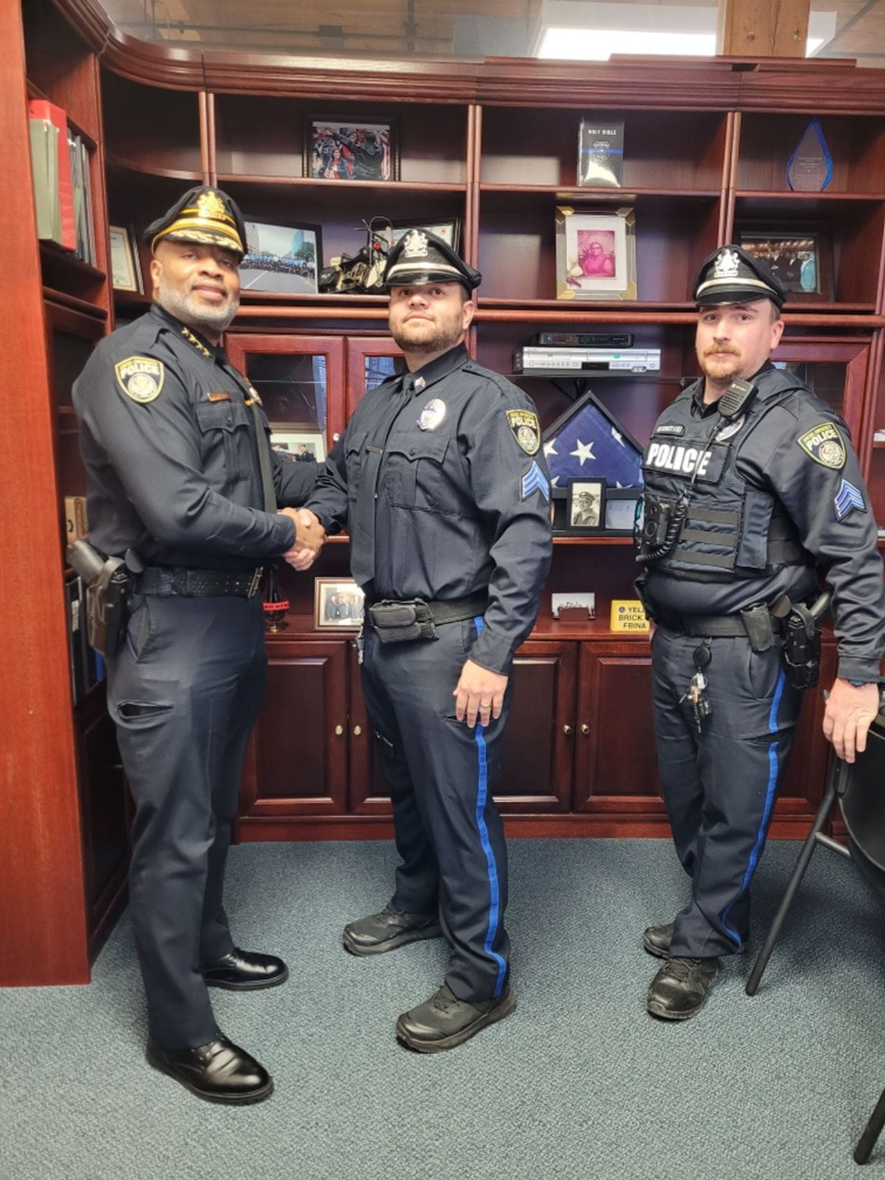Tim Adkins pictured shaking hands with Vice President of Public Safety Mel Singleton Jr.