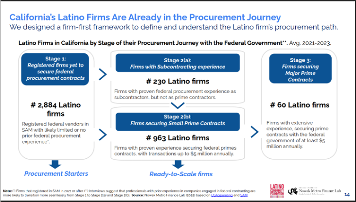 California represents a unique opportunity. In 2024, the State’s GDP surpassed Japan’s, making it the fourth-largest economy in the world, and California is home to 4 of the 10 U.S. metros with the highest concentration of Latino-owned businesses (LOBs). Direct federal spending in California to vendors totals $71 billion. However, despite California’s Latino population, only 2% of federal contracts are captured by LOBs.