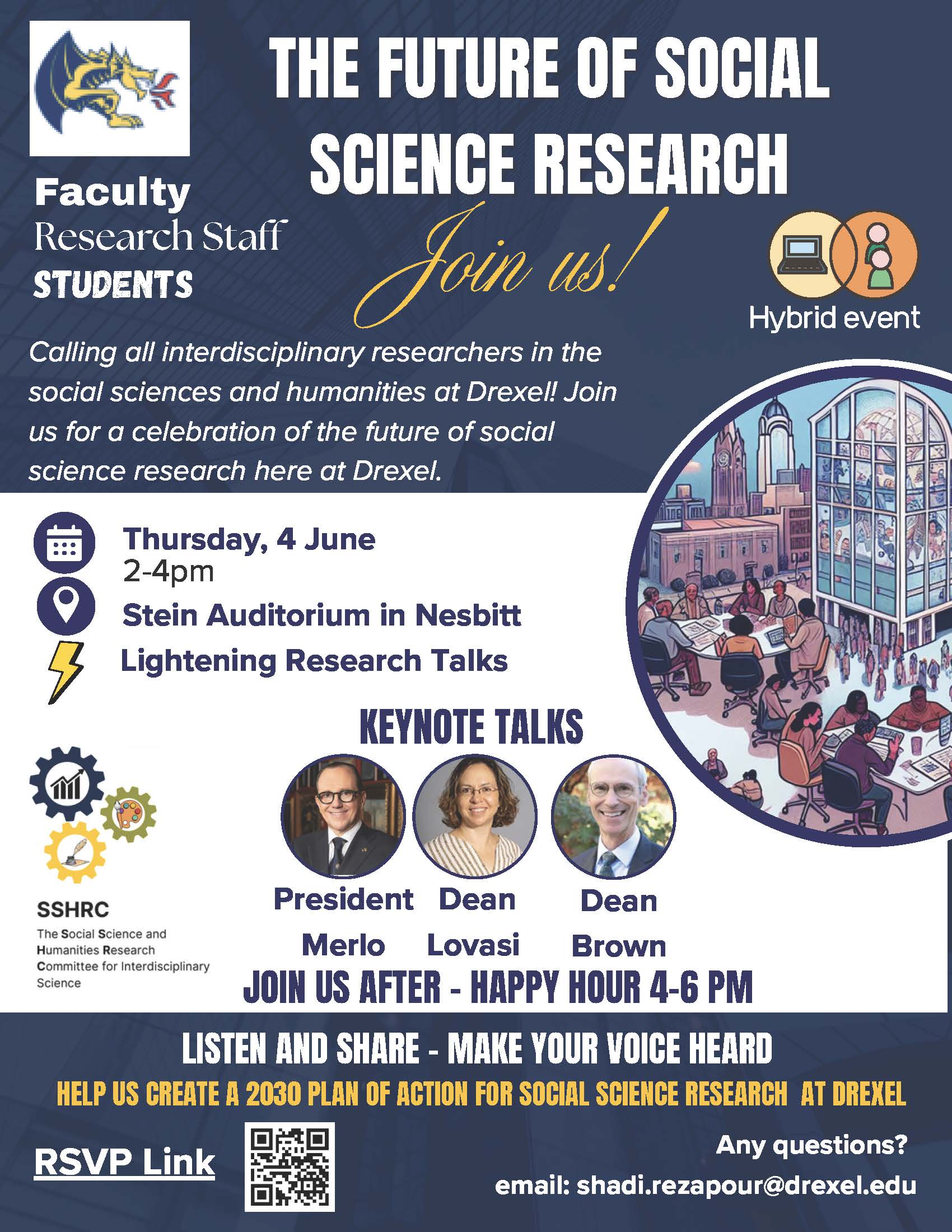 Interdisciplinary researchers across Drexel’s social sciences and humanities are invited to take part in a forward-looking conversation on the future of research at the University. Hosted by the Social Sciences and Humanities Research Committee (SSHRC), this hybrid convening will bring together faculty, students, and research staff to celebrate and help shape a 2030 plan of action for social science research at Drexel University.