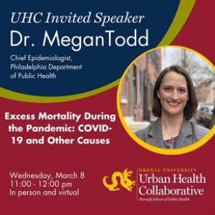 The Drexel Urban Health Collaborative is pleased to host our next invited speaker, Dr. Megan Todd, Chief Epidemiologist at the Philadelphia Department of Public Health. Dr. Todd will present Excess Mortality During the Pandemic: COVID-19 and Other Causes, and will be available to briefly answer questions after the talk.