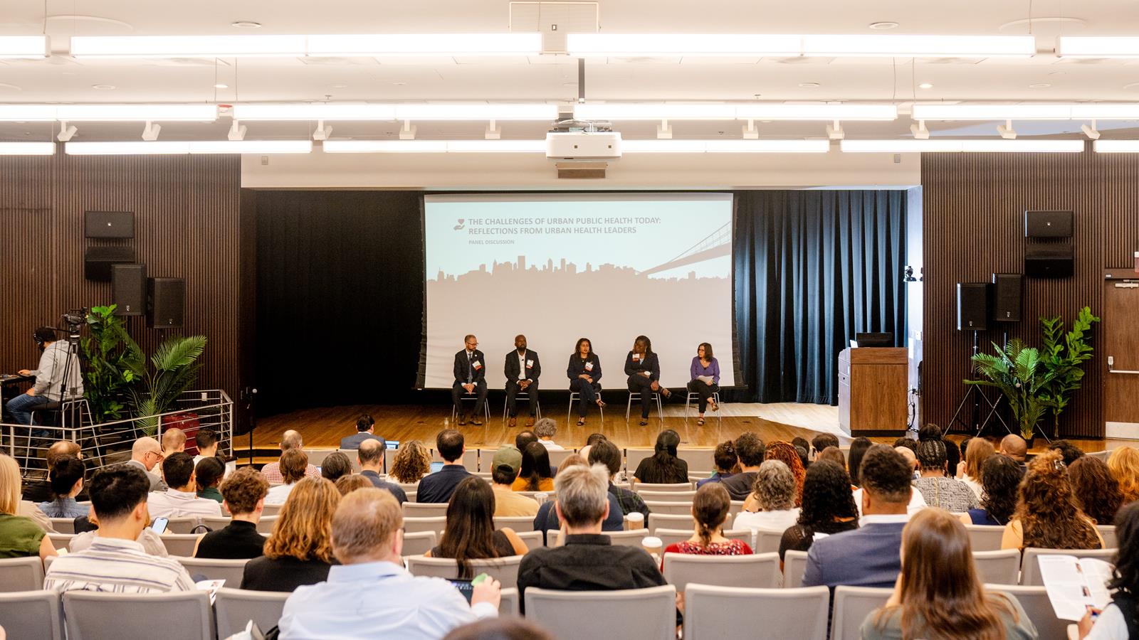 Crowd of attendees in Nesbitt Hall auditorium listens to panelists on stage discuss "The Challenges of Urban Public Health Today: Reflections from Urban Health Leaders" at the 2025 symposium.