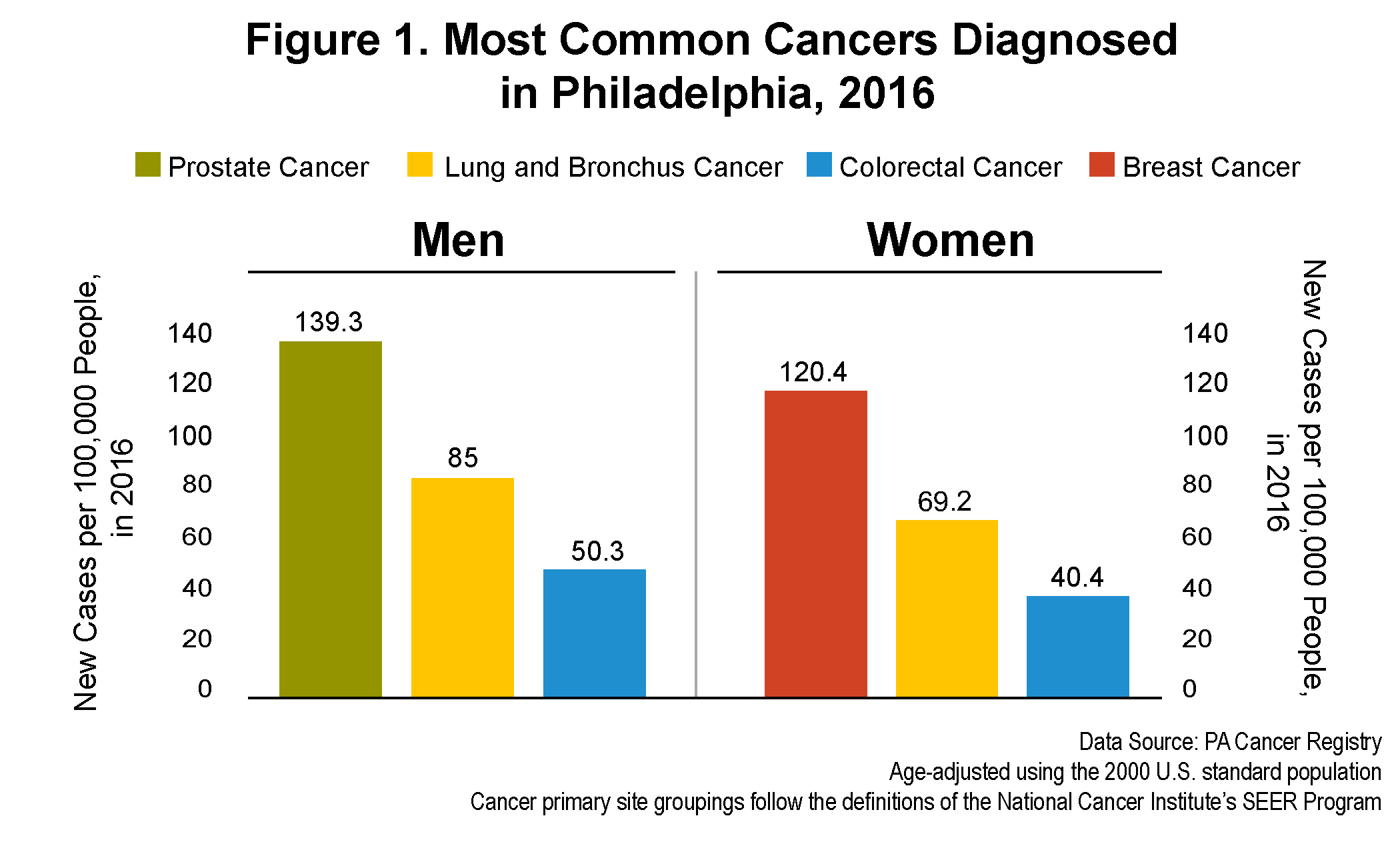 In 2016, 7,972 people in Philadelphia were newly diagnosed with cancer. This amounts to 478 new cases of cancer for every 100,000 Philadelphians (this number is called the incidence rate). Cancer is somewhat more common in men than in women: there were 528 new cases of cancer for every 100,000 men and 446 new cases of cancer for every 100,000 women in the city in 2016.1