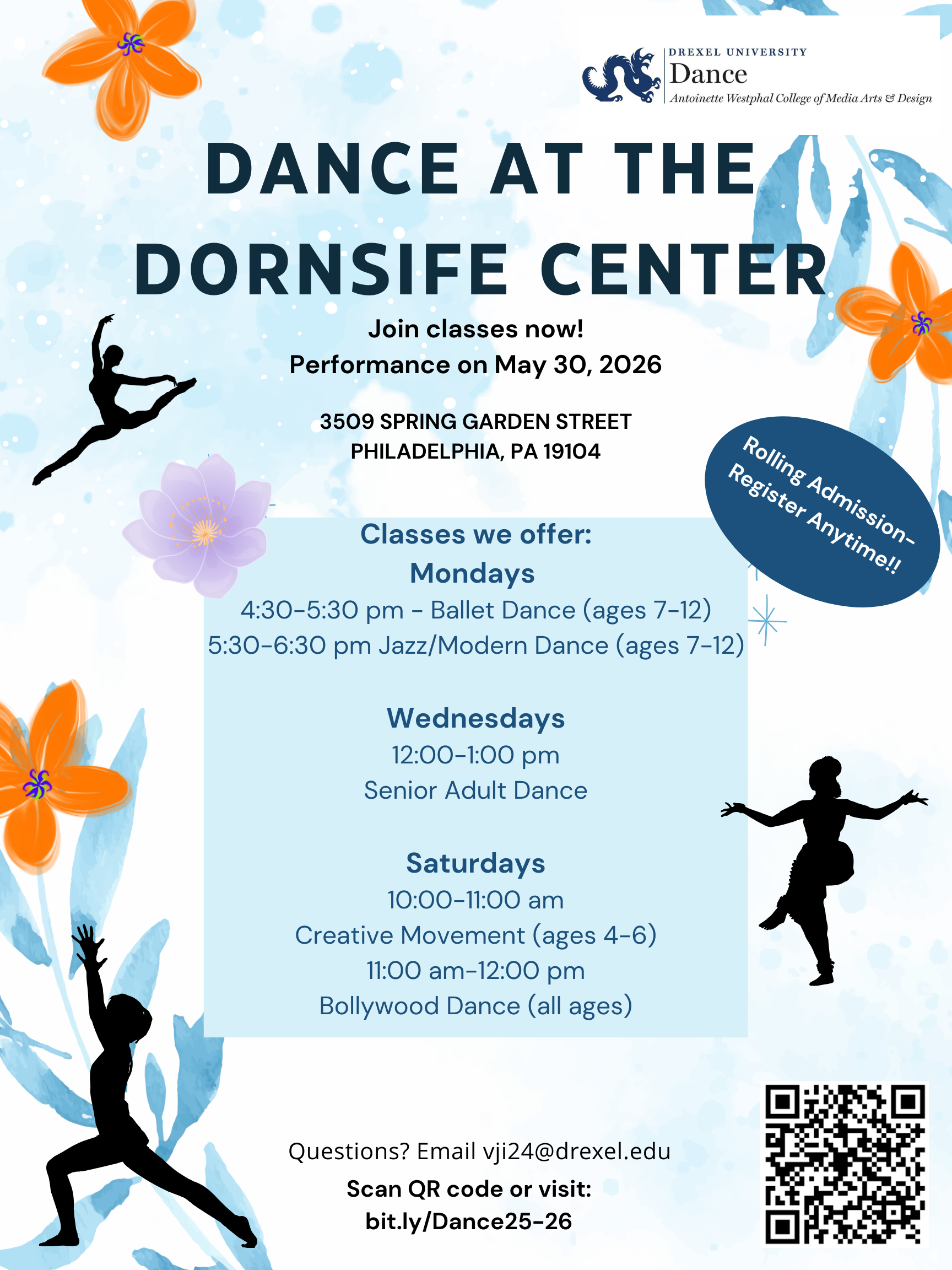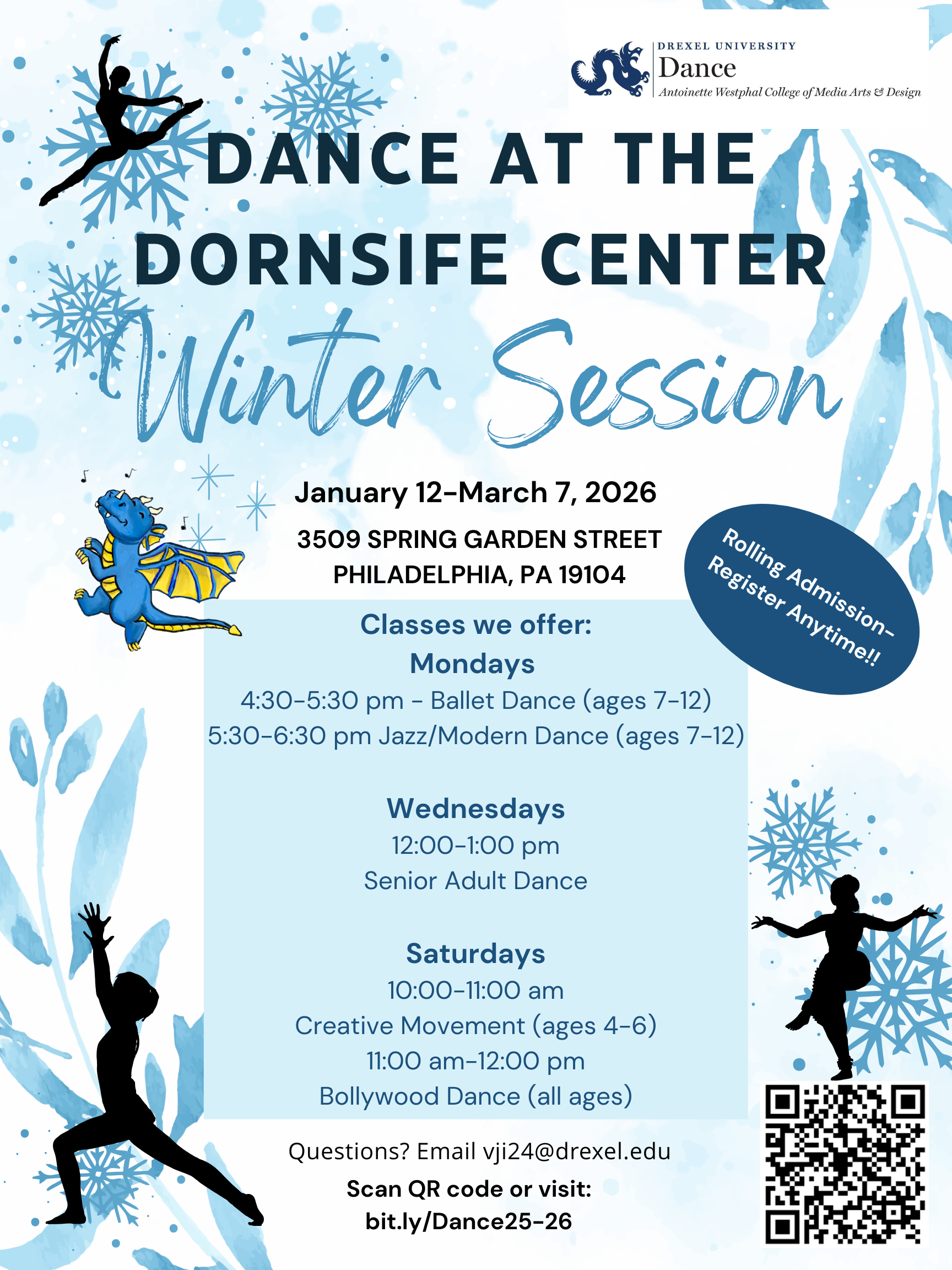 Drexel dancers are partnered with the Dornsife Center for Community Partnerships to offer free dance classes to community members of all ages in West Philadelphia. Weekly dance classes are taught by Drexel dance students and alumni and mentored by Drexel dance faculty.